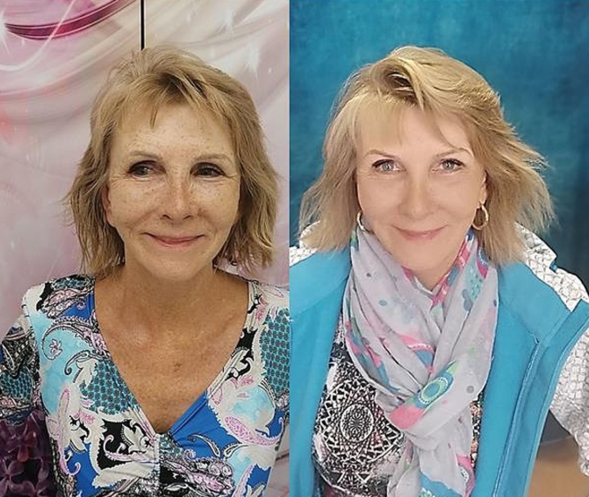 VLEVO 70LETÁ KLIENTKA PO SUNDÁNÍ MASKY A VPRAVO 75LETÁ KLIENTKA PO SUNDÁNÍ ZLATÉ MASKY.