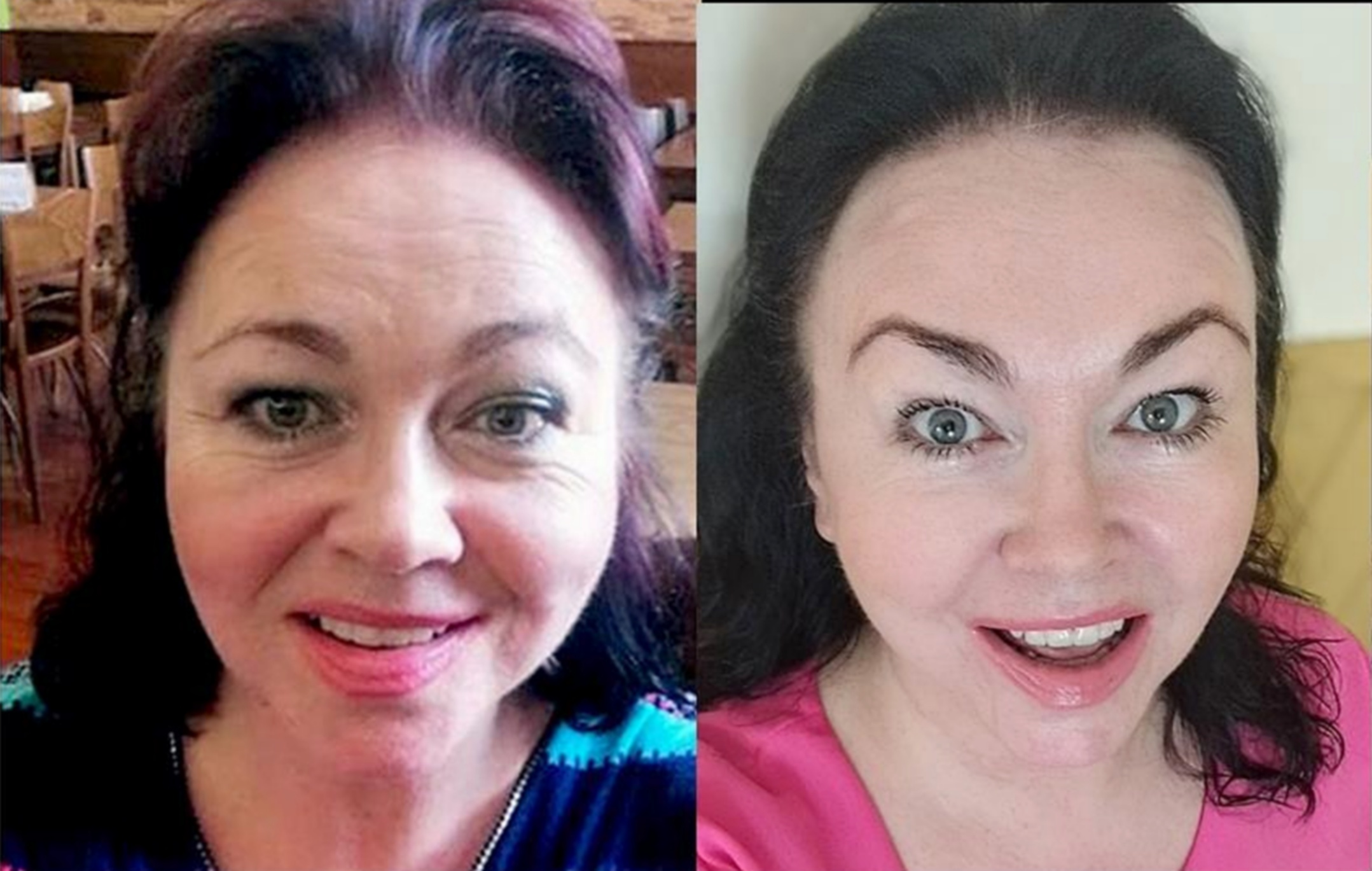 Fotografie bez retuší a úprav na denním světle. Vlevo před všemi procedurami a vpravo po všech ošetřeních. Je mi 56,5 let.