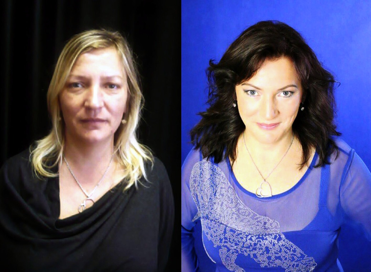 Ve svých 27 letech na počátku dráhy vizážistky, KDE MI ÚČES A BARVU VLASŮ NAVRHLI NA ÚČESOVÉM POČÍTAČI A BARVU A STŘIH REALIZOVALI V JEDNOM NEJLUXUSNĚJŠÍCH KADEŘNICTVÍCH. VPRAVO Ve svých 43 letech v šatech, které jsem si navrhla a ve svém účesu, KTERÝ JSEM SI NAVRHLA NA ZÁKLADĚ OBLIČEJOVÉ A BAREVNÉ TYPOLOGIE. Vlevo mám 67 kg a vpravo 81 kg.