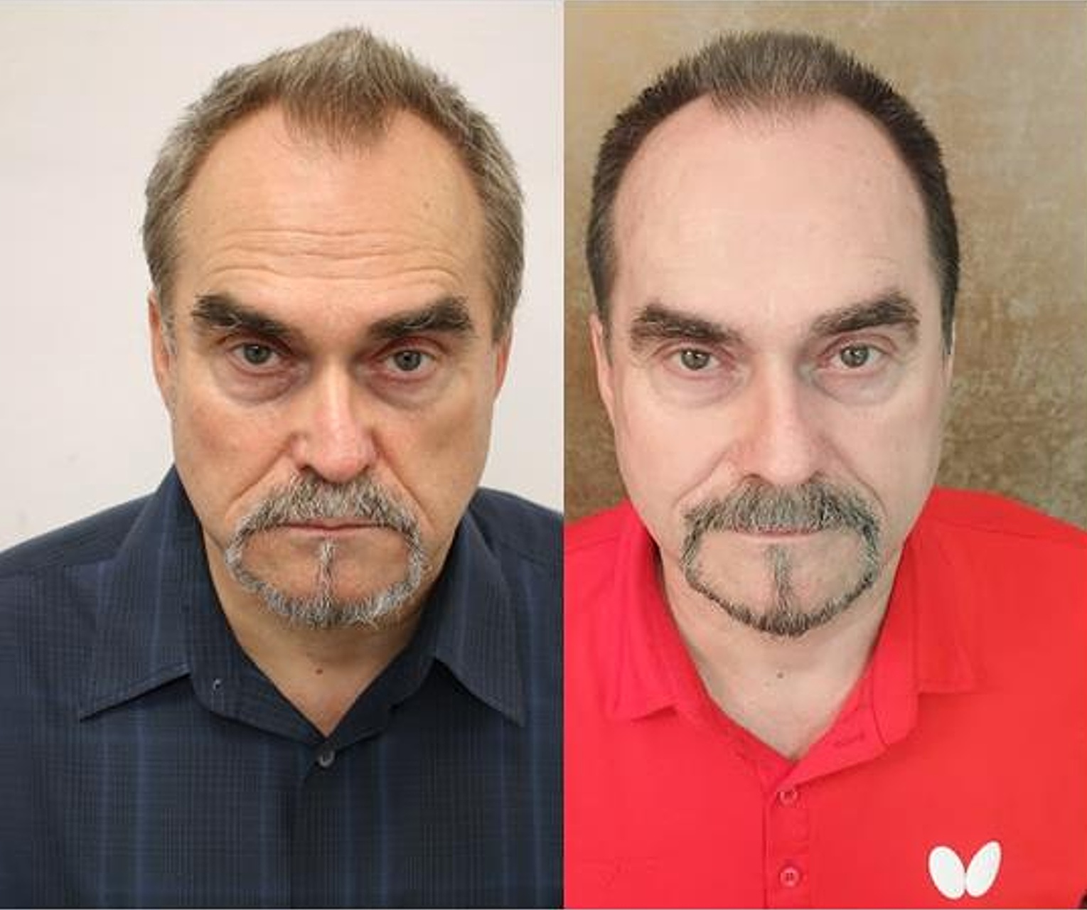 Muž 61 let vlevo v den ošetření v nelichotivé tmavé barvě. Vpravo už více omlazující barva. Mohu Vašeho blízkého muže nebo Vás omladit i barvami oblečení, provádím už 30 let Barevnou typologii pro ženy i pro muže. Více na www.barevnatypologie.cz a fotografie mužů ZDE