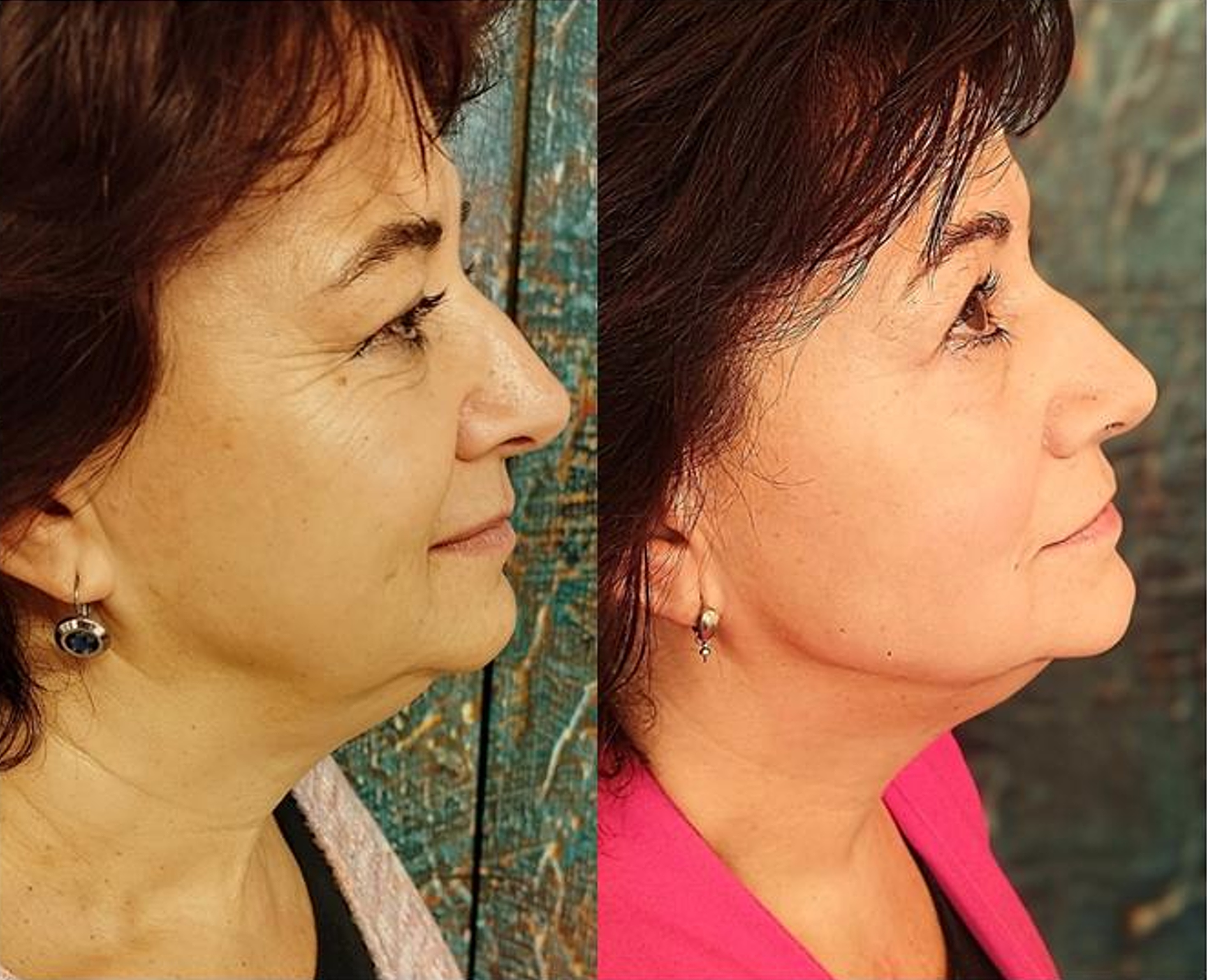 Vlevo před v 52 letech a vpravo po 3 letech v 55 letech. Absolvovala jsem omlazení Thermage EXTRA SILNÉ 3x za 3 roky, 5 Mikrojehličkování a 2x ošetření přístrojem HIFU.