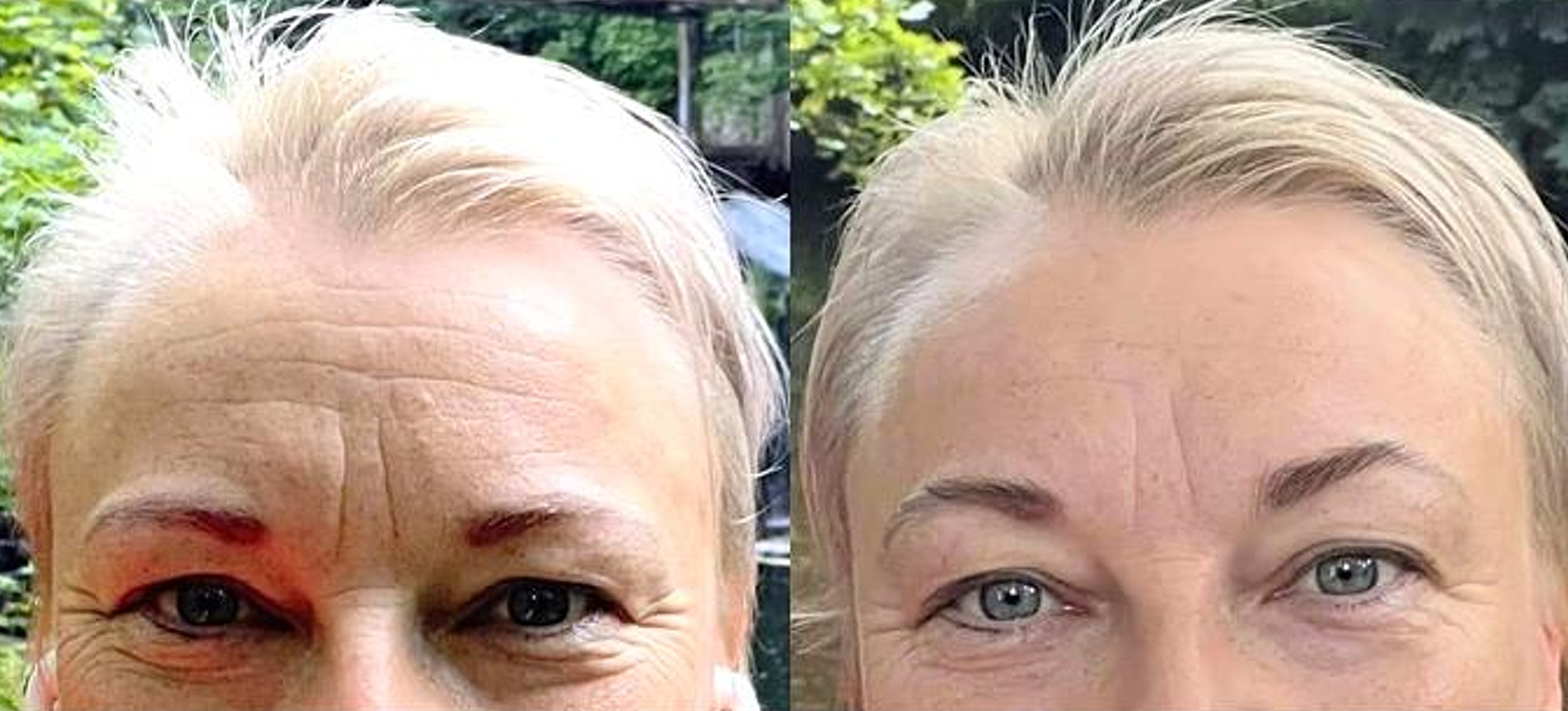 Žena 48 let den před tímto DVOJITÝM OMLAZENÍM ČELA A OČNÍHO OKOLÍ a druhý den po ošetření. Vlastní foto klientky.